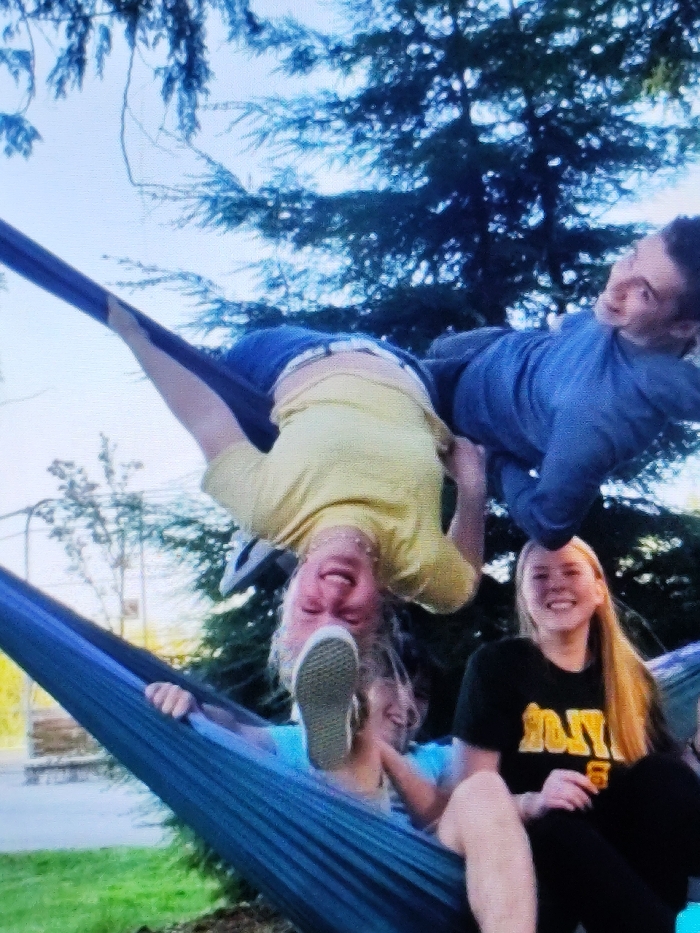 The image depicts four individuals engaged in recreational activity within an outdoor, verdant setting. In the foreground, a blue fabric hammock is suspended, hosting three visible individuals and partially obscuring a fourth. One individual, with blonde hair and wearing a light yellow t-shirt and blue jeans, is positioned upside down within the hammock, smiling broadly towards the viewer. Their head is at the bottom center of the frame, with a white Vans-style shoe on their left foot visible towards the upper left. A white beaded necklace is around their neck. Resting horizontally across the torso of the upside-down individual is a second person, a male with dark hair, wearing a blue long-sleeved shirt and dark pants. He is looking towards the upper right of the frame and smiling. To the lower right, a third individual with blonde hair is seated upright within the hammock, wearing a black t-shirt with yellow "SOX" lettering and black pants. This person is also smiling towards the viewer. Partially obscured behind this individual and within the hammock, a fourth person's head is faintly visible. The background consists of dark green coniferous trees against a bright, clear sky, indicating daytime. Green grass is visible in the lower left portion of the frame. There are no identifiable landmarks or street signs within the image to confirm a specific location within the city of Charleroi, Belgium.