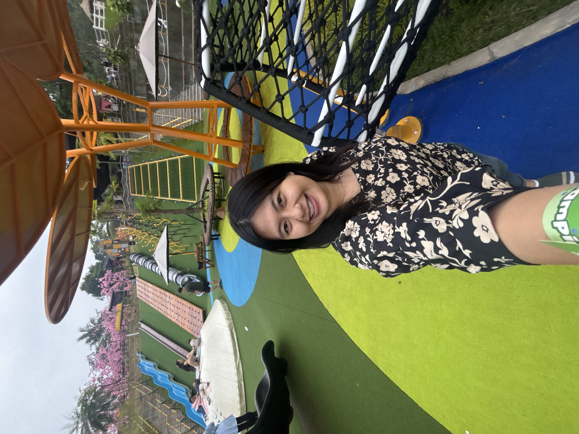 A woman with dark hair is smiling and appears to be taking a selfie on playground equipment. The playground is in Prigen, Indonesia. The playground has a variety of colorful surfaces and equipment, including a yellow airplane structure, black and white net-like structures, slides, climbing walls, and other play features. Pink flowering trees are visible in the background. People are scattered throughout the playground.