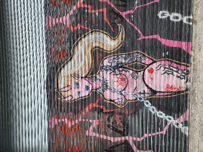 Graffiti adorns a corrugated metal surface. A blonde, blue-eyed figure with tattoos and chains, seemingly nude, lies horizontally. Lightning bolts in red and pink streak across the dark background. The metal’s ridges add texture and distortion to the artwork, which includes white lettering at the top right. Another metal sheet stands vertically at the left.