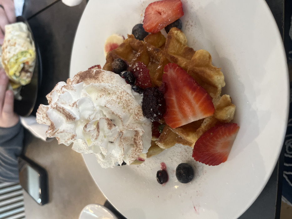 - "A white plate displays waffles topped with whipped cream, strawberries, blueberries, and blackberries" by FM-2bnDB3, licensed under CC BY 4.0