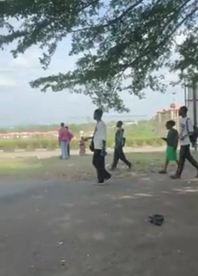 group of people walking along a paved path on a sunny day. There are trees providing shade along the path. In the background, there are buildings and a grassy area. The camera is handheld and follows the people as they walk. Some people are standing or sitting under a covered structure near a tennis court. The camera focuses on people walking along the path. The video appears to be shot outdoors.