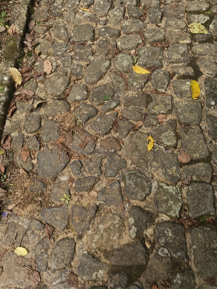 A textured ground covers most of the image, consisting of irregularly shaped stones. These stones have varied tones, including grey, brown, and hints of green. The spaces between the stones are filled with dirt and small bits of debris such as fallen leaves and twigs. A line of larger, moss-covered stones borders the scene's left edge. Small patches of greenery, including a few scattered leaves and tiny plants, are visible.