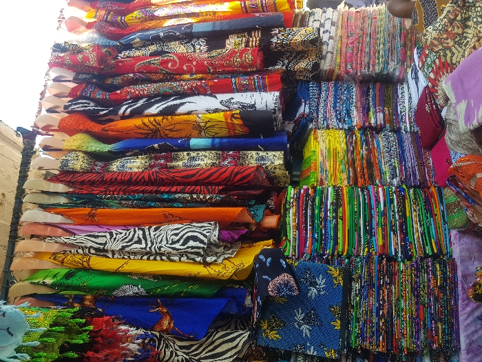 This image displays a vibrant textile and garment stall, characteristic of an open-air market in Mombasa, Kenya