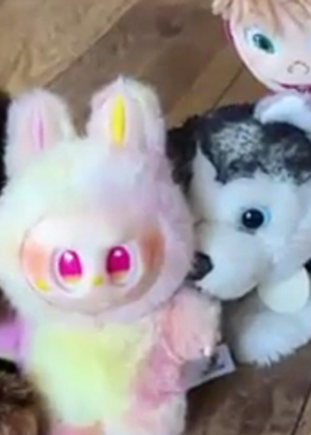Four stuffed animals are arranged on a wooden floor. The animals are a brown teddy bear, a light pink and yellow fuzzy toy with a plastic face, a husky dog, and a doll riding the dog. The pink and yellow toy has large, bright pink eyes and tiny teeth. A cartoon song plays in the background. The camera zooms in on the pink and yellow toy’s face.