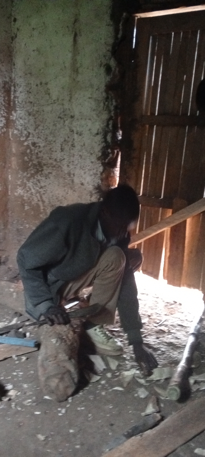 An individual is observed squatting in an interior room in Abengwa, Democratic Republic of the Congo. The room features uneven, mottled light-colored walls and a dark, uneven floor covered with wood shavings and fragments. A light source, likely a window or door composed of vertical wooden planks, is visible on the right side of the frame, providing strong backlight. The individual is an adult male, wearing a dark long-sleeved top and light brown trousers. A light-colored sneaker is present on the right foot, while the left foot appears bare or in dark footwear. He is focused downwards, his left hand holding a dark, slender tool or metal rod against a rough, irregularly shaped wooden log or block positioned on the floor directly in front of him. To the left of the wooden log, a blue pipe-like object is visible on the floor, along with additional scattered wooden debris. The scene depicts manual labor, specifically the processing or shaping of wood.
