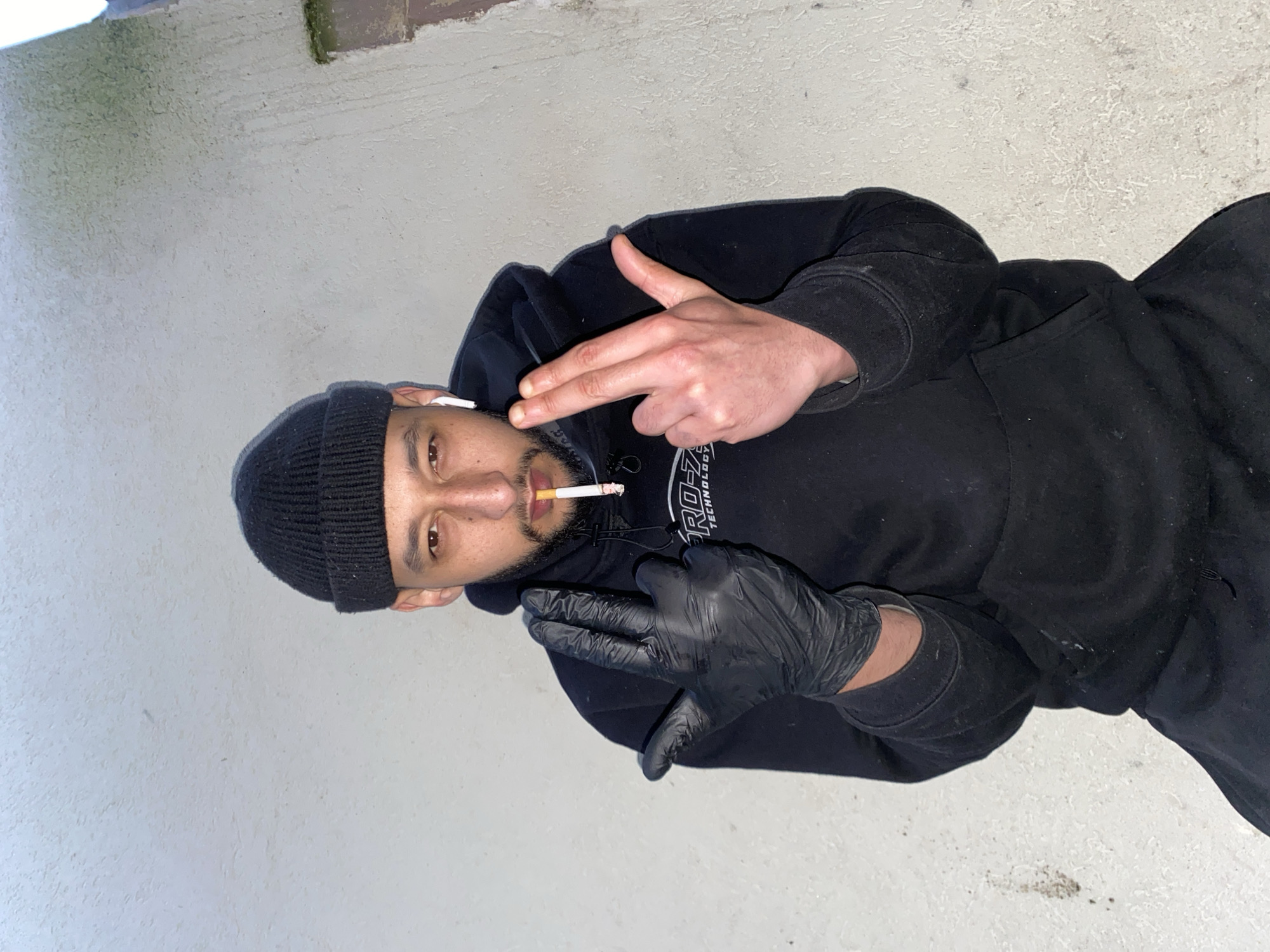 A man with tanned skin, wearing a black beanie, black hooded sweatshirt, and black gloves, is lying on a light grey concrete surface. He has a cigarette in his mouth and is holding up both hands, fingers extended, mimicking the shape of handguns. An earbud is visible in his left ear. The location appears to be an outdoor space, possibly a street or alleyway. The image does not provide enough information to specify the location in Schiltigheim, France.
