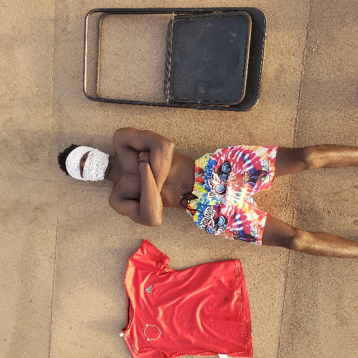 An overhead view depicts a male individual lying on his back on a light brown, textured ground surface in an outdoor location in Narayi, Nigeria. The individual's face is completely obscured by white bandage-like material. He is shirtless, exposing his upper torso, and wears colorful tie-dye patterned shorts featuring various graphics, including "MOSCHINO" text and vehicles. His arms are crossed over his chest, and a navel piercing is visible. To the individual's left, a red short-sleeved t-shirt with a white Adidas logo and a hexagonal outline lies flat on the ground. To his right, a black metal folding chair is present in a folded position. The lighting suggests daytime conditions.