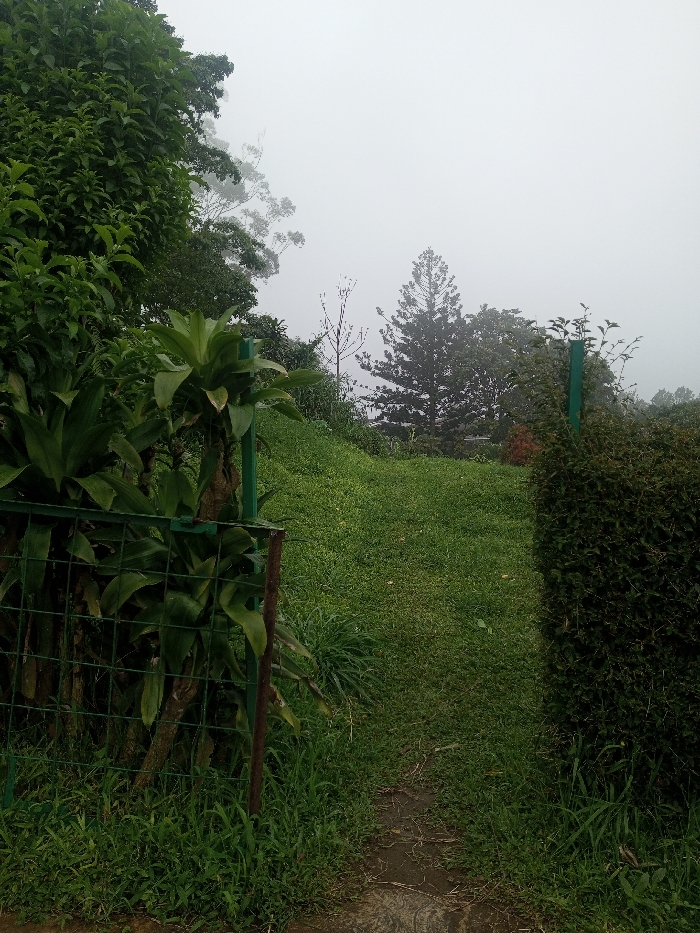 The image displays an outdoor, natural landscape in Irupalai, Sri Lanka, shrouded in heavy mist or fog that obscures the distant horizon. The foreground features a dark green wire mesh fence on the left, partially obscured by large-leafed green tropical plants with thick stems. A vertical, rust-colored bar is visible at the edge of the fence, potentially part of a gate structure. A narrow, dark dirt path, possibly damp, originates at the bottom center and ascends gently into a verdant, upward-sloping grassy area. To the right of this path, a dense, manicured green hedge with small leaves forms a defined border, supported by a green post. The midground consists primarily of this lush green grass. In the background, a prominent dark green coniferous tree with a distinct pointed apex stands out, partially veiled by the pervasive mist, alongside other less defined trees and dense foliage. No individuals or animals are present in the scene, and no specific actions or interactions are depicted.