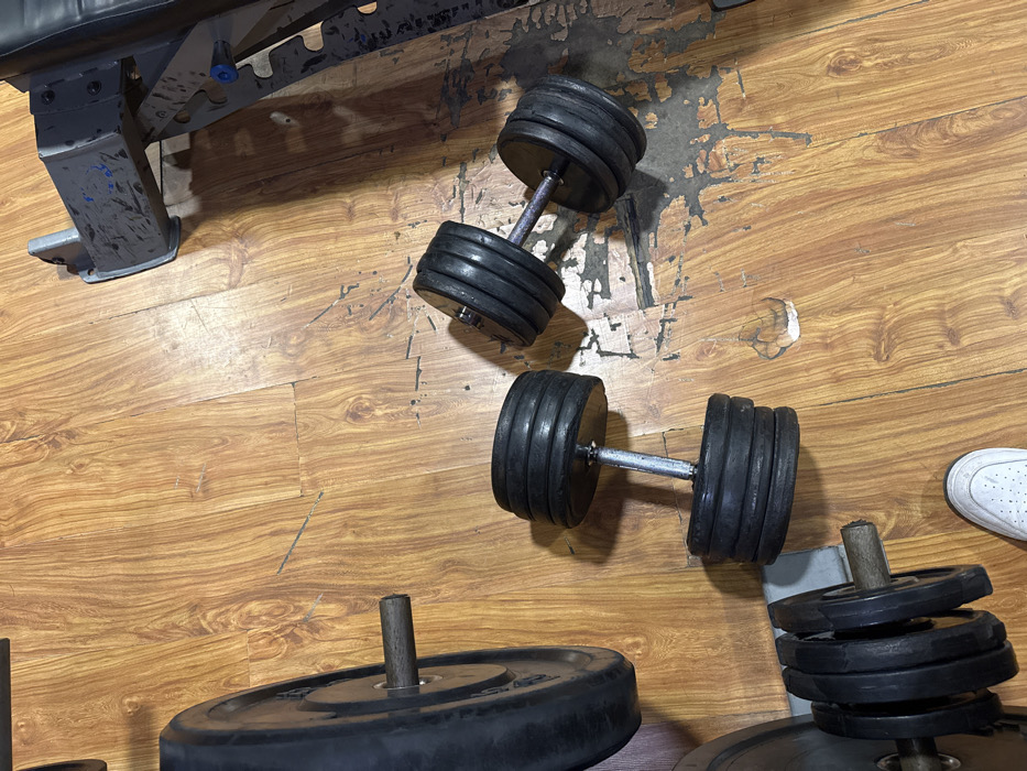 The image depicts an indoor gym setting in Kyustendil, Bulgaria, characterized by a worn, light brown wood-patterned laminate floor. The flooring exhibits significant wear, including numerous scratches, scuffs, and areas where the surface layer is chipped or eroded, particularly in the upper-right and central-right sections. Three sets of free weights are visible within the frame. Two assembled dumbbells rest on the floor in the center and center-right. Each dumbbell features a silver-toned metal handle and is loaded with multiple circular, black weight plates on both ends, consistent with rubber-coated or cast-iron construction. A third, larger set of black weight plates on a dark bar, possibly part of a barbell or another heavy dumbbell, is partially visible extending from the left edge of the frame. The lower portion of a dark-colored weight bench, featuring a scuffed metal frame and dark upholstery, is present in the upper-right quadrant. The front section of a white athletic shoe is visible in the lower-left corner, indicating the immediate proximity of an individual. No other persons or specific actions are depicted.