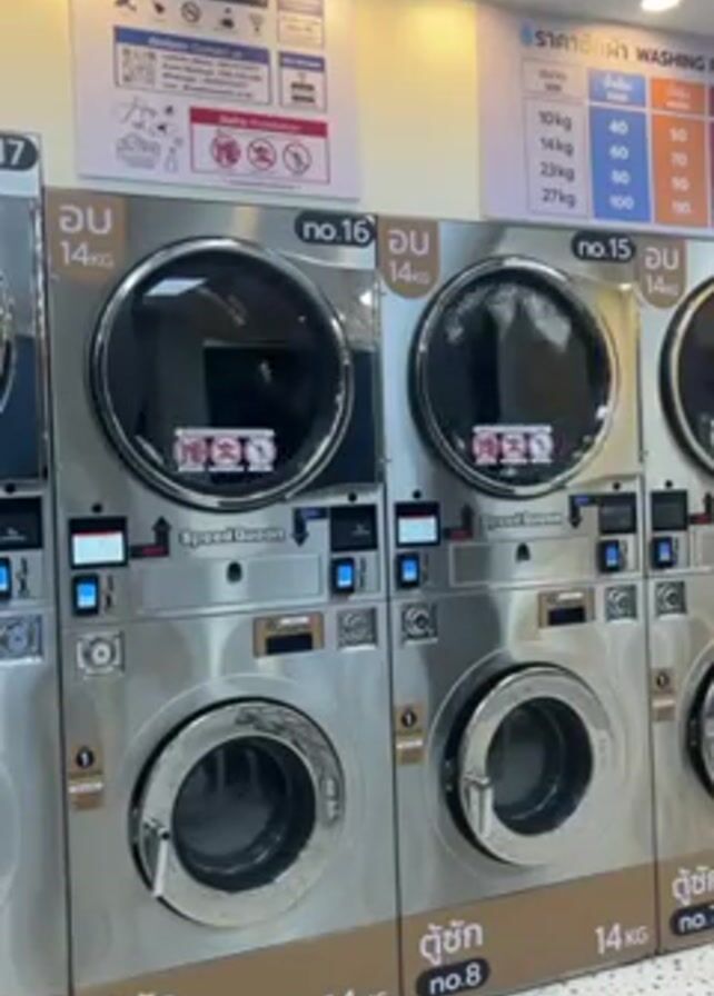 row of Speed Queen washing machines in a laundromat. The machines are stainless steel and have a capacity of 14 kg. Some of the machines are in use, and clothes can be seen through the glass doors. There are signs in Thai and English indicating the prices for washing. The environment appears clean and well-lit. The focus is primarily on the appearance and functionality of the washing machines in the laundromat setting.