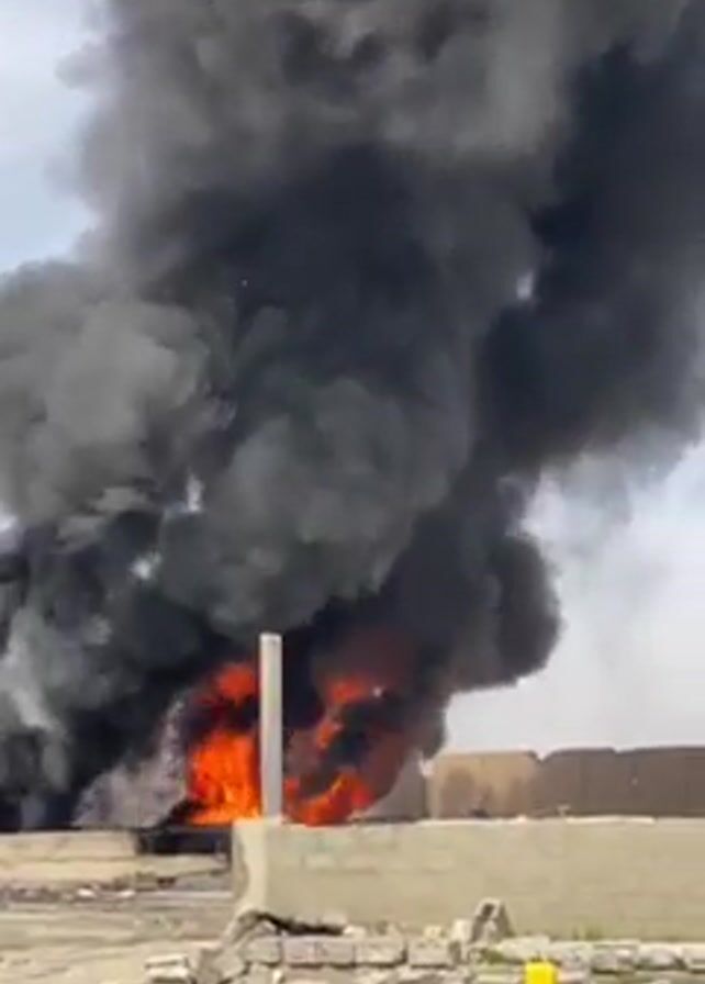 large fire, with black smoke billowing into the sky, near a building or structure. The fire is intense, with visible flames. The surrounding area appears to be a construction site or an industrial zone, with concrete debris and unfinished structures in view. The sky is overcast, and the overall scene is chaotic and suggests a dangerous situation. There is no sign of people in the immediate vicinity.
