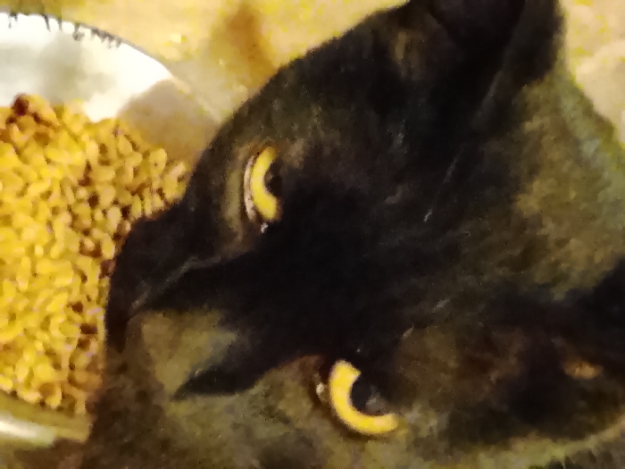 A high-angle, close-up photograph depicts the head and upper torso of a domestic cat within an indoor setting in the city of Unknown, Unknown. The cat exhibits predominantly black fur with subtle brown-yellow highlights and distinct bright yellow irises. Its head is oriented downwards and towards the left, where a metallic bowl containing numerous small, oval, light-colored dry cat food pellets is partially visible. No human subjects are present. The cat appears to be observing the food. The immediate background is an indistinct, light-colored surface.
