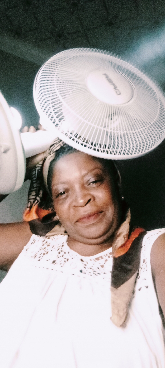 A woman wearing a white crochet top and a patterned headscarf poses with a white fan held above her head. The fan's blades are obscured by motion blur. A second fan is slightly visible to the left, partially out of focus. The background features a dark ceiling. The image appears to be taken at a close-up angle, focusing on the woman's face and the fan overhead.