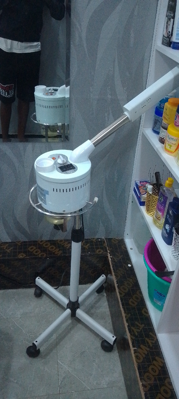 The image depicts an indoor scene, likely within a salon or beauty treatment establishment in Matathani ward, Kenya. In the foreground, a white, mobile facial steamer is positioned centrally. It consists of a cylindrical main unit with ventilation slots, a control panel on its top surface featuring a rotary dial and two rocker switches, and an adjustable, articulated arm ending in a nozzle. This unit is mounted on a height-adjustable stand with a five-star base equipped with black caster wheels. A circular chrome-plated rail surrounds the upper portion of the steamer unit. To the left, a vertical rectangular mirror is affixed to a grey wall patterned with subtle wavy designs. The mirror reflects the lower torso and legs of an individual wearing a dark top (partially visible), a white undershirt, and black shorts with a white graphic on the left leg. The individual's skin appears dark. The mirror also reflects the upper section of the steamer. To the right of the steamer, a white, open shelving unit is visible. The top shelf holds multiple plastic bottles of various colors and sizes, appearing to be hair or beauty products, with "Bamsi Hair Food" partially legible on a yellow bottle. The middle shelf contains additional bottles, including a clear one with purple liquid and a dark blue one, along with several dark brushes and a small golden metallic container. The bottom shelf holds a two-tone green and pink plastic bucket, partially filled with dark items. The floor beneath the steamer and extending to the left is covered with light grey square tiles exhibiting a subtle dark veining pattern. To the right, beneath the shelving unit, the floor transitions to a dark plywood or particle board material displaying repeated white text, primarily "WOOD" and "TY" in a grid formation.