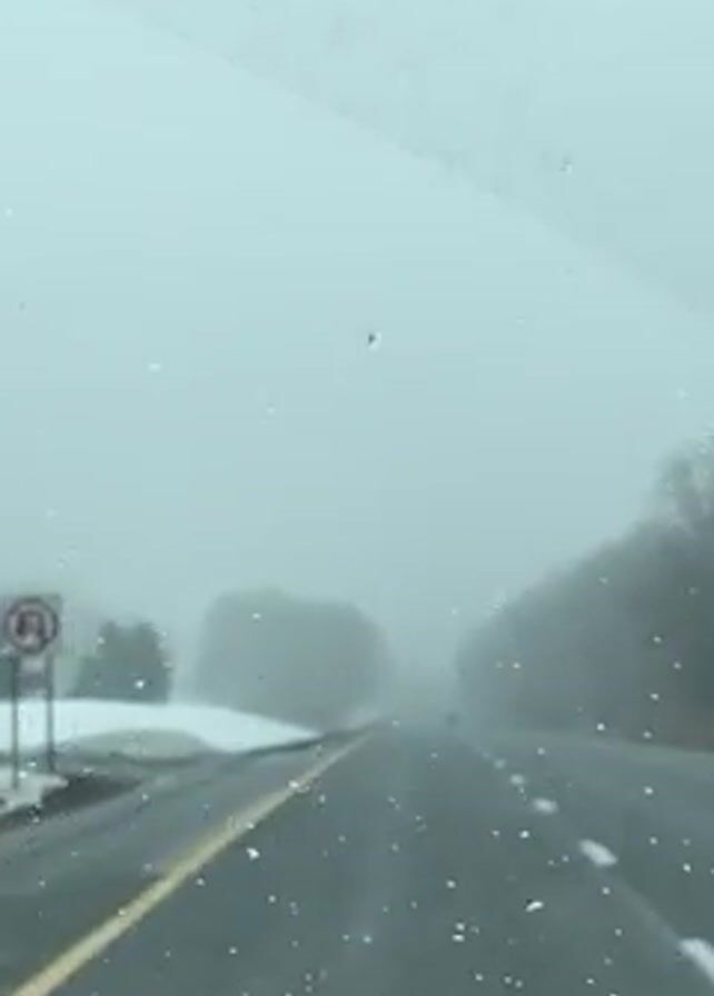 The view from the inside of a car driving on a road during snowy weather is depicted