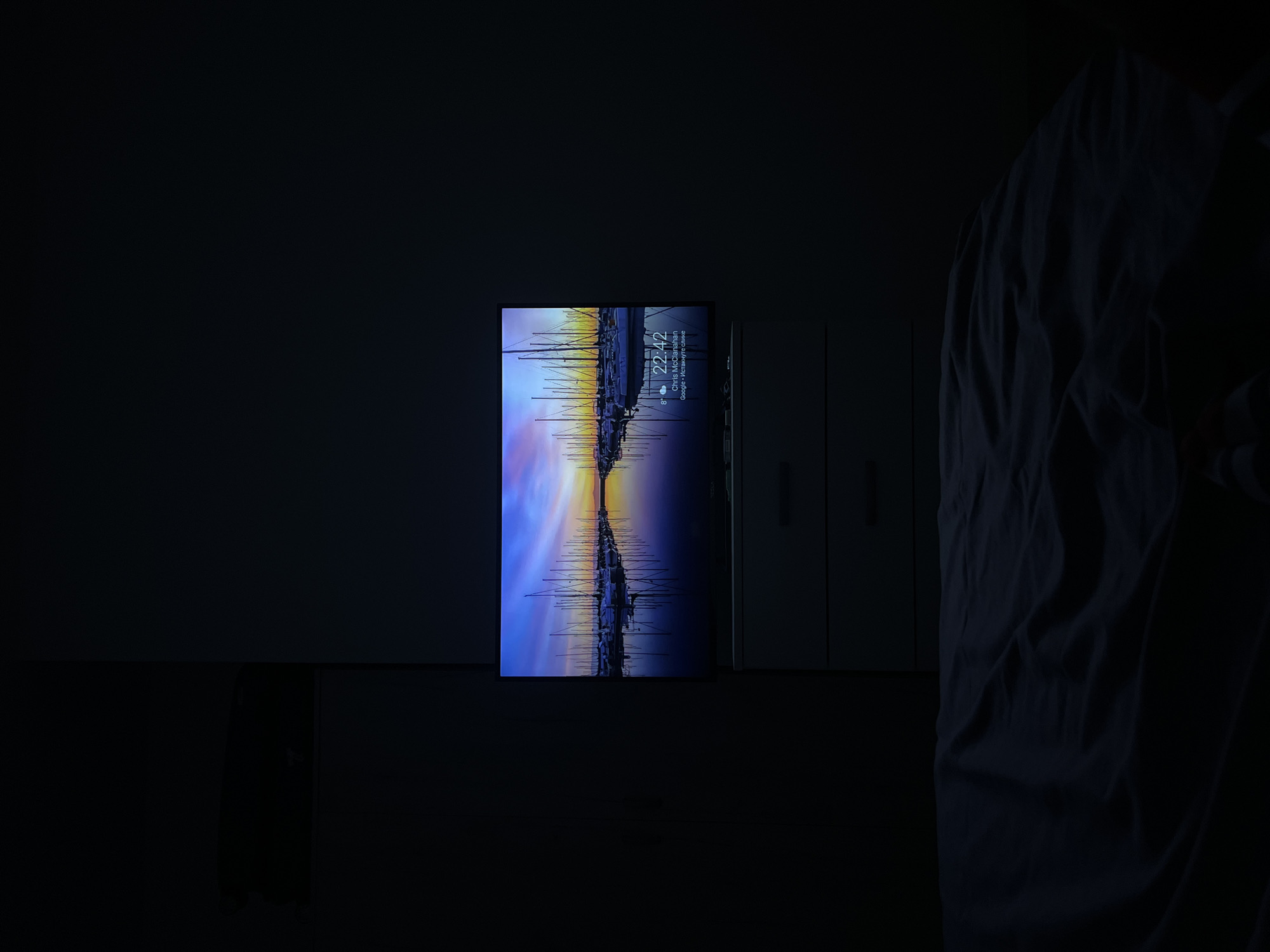 A darkened indoor scene features a brightly lit rectangular display, presumably a television or monitor, showing a landscape image oriented vertically. The image on the display depicts a harbor scene with numerous sailboats, their masts reflected in the water, under a colorful sky transitioning from blue to orange. The top right corner of the display shows the time "22:42" and other smaller text. The display rests on a dark, low surface that appears to be a cabinet or shelf. To the right of the display are dark, vertical panels suggesting a closet or other storage unit. On the extreme right side of the frame, a draped dark material, possibly clothing, is visible. The overall environment is dimly lit, with the display's light providing the primary illumination. Although Rafailovići, Montenegro, is a coastal city and sailboats match the image, it is impossible to say for sure from the image if that is the exact location.