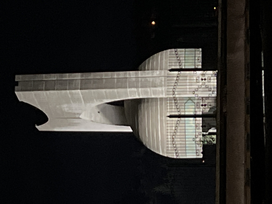 At night, a horizontal architectural structure dominates the frame. A large, arching, concrete element extends from the left, transitioning into a building with vertical lines and grid-like patterns. A dark background contrasts with the structure's light tones. To the right, vertical architectural details frame part of the building. A light glows near the upper portion of the image.