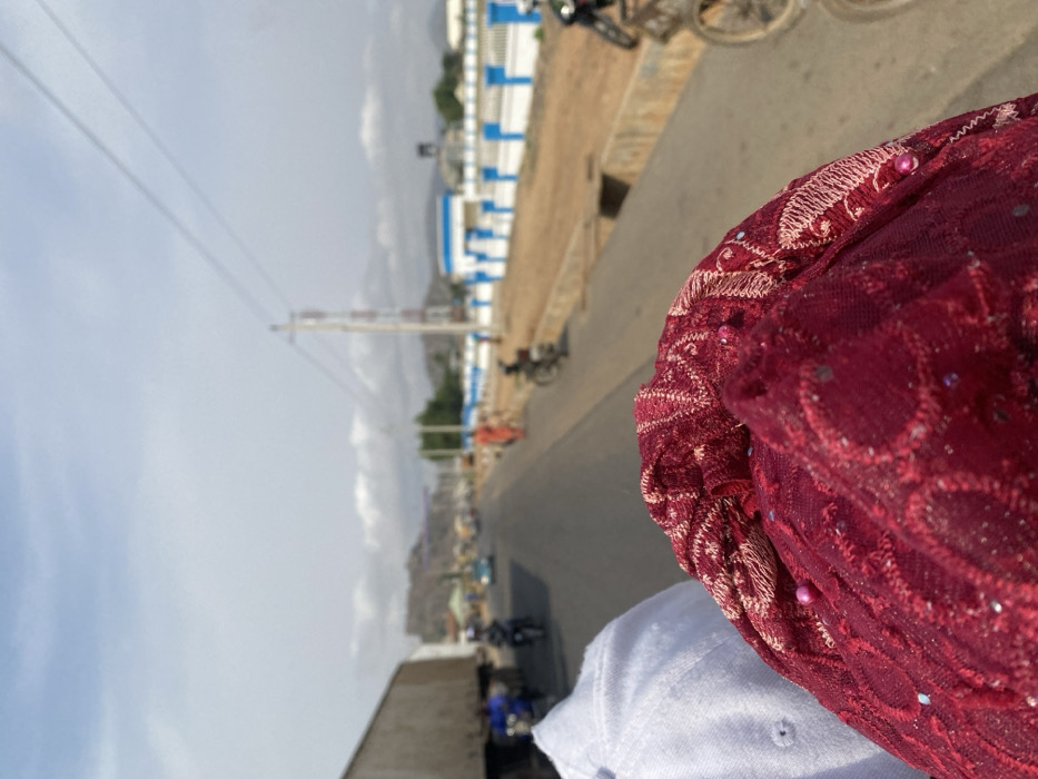The image depicts an outdoor, daylight scene along a paved roadway in Abobo, Nigeria, observed from a low vantage point, likely from within a vehicle or atop a motorcycle. In the immediate foreground, out of focus, are the upper portion of a white fabric object, resembling a cap or head covering, and a prominent dark red, intricately patterned fabric, possibly lace or embroidered, adorned with small, reflective elements like sequins or beads, dominating the lower right quadrant. The road stretches into the distance, populated with various vehicles and individuals. On the left side of the road, a large, light-colored cargo truck is visible, followed by at least two individuals operating motorcycles and several passenger vehicles, one of which appears light blue. On the right side of the roadway, a raised dirt shoulder borders a prominent white wall accented with blue pillars or trim, possibly belonging to a compound or facility. A person wearing an orange garment is walking on the right side of the road, and another individual is seen on a bicycle further along, near the white and blue wall. Utility poles with overhead wires line the road, and a tall cellular communication tower is visible in the mid-distance on the right. The background features a range of hills or low mountains under a partly cloudy sky.