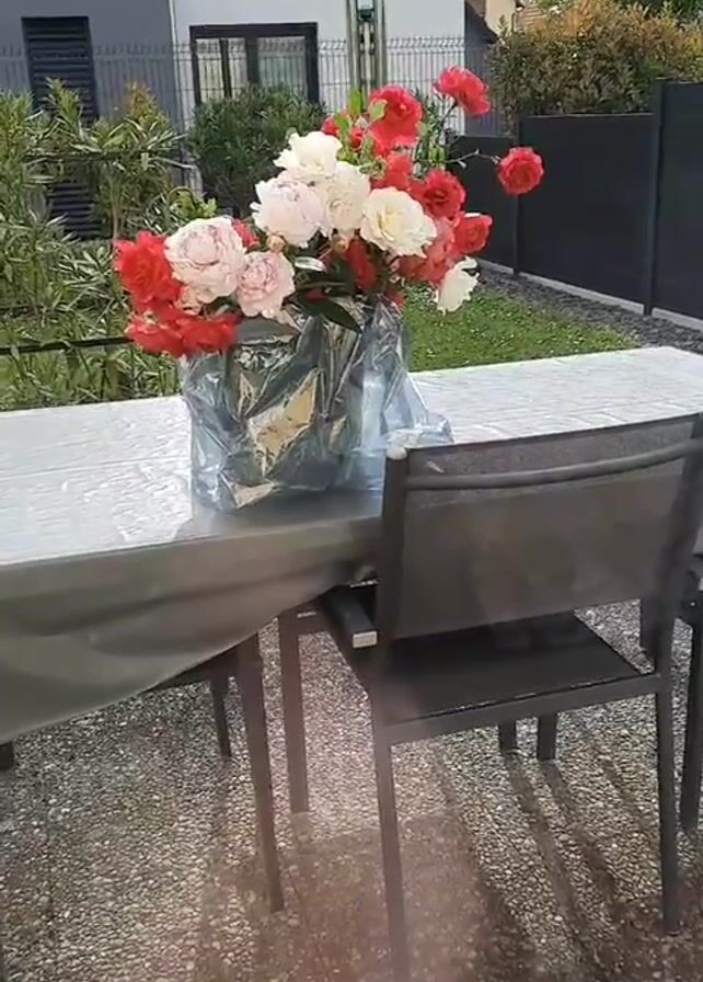 table on a patio. The table is covered with a gray tablecloth. On the table is a vase filled with red, white, and pink roses. There are chairs around the table. The patio is in front of a house with a lawn and black fencing.