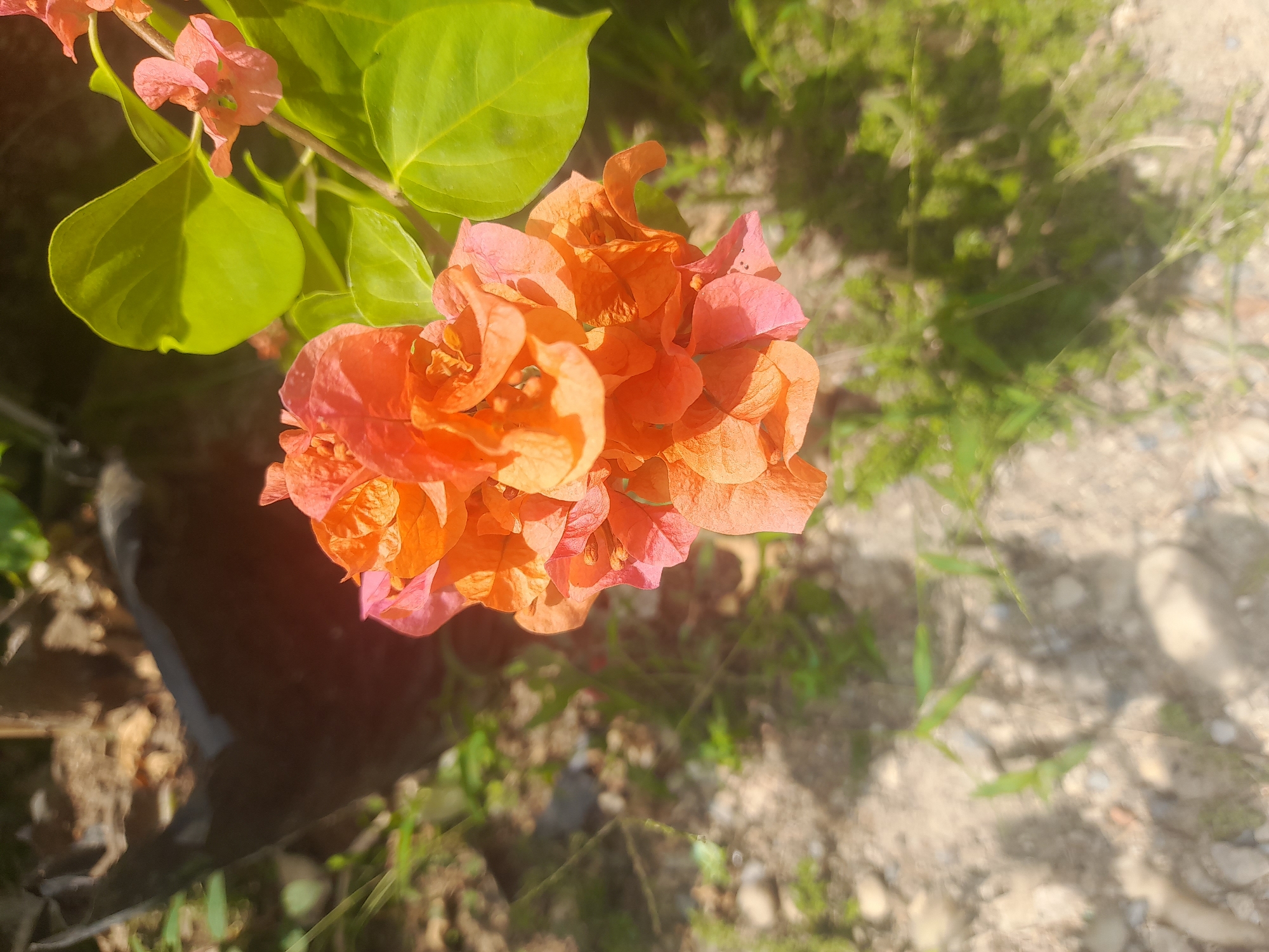 cluster of orange bougainvillea flowers in Tinaquillo, Venezuela. The flowers are clustered together, with some green leaves visible. The background is a mix of soil, grass, and gravel. There are no people visible in the image.