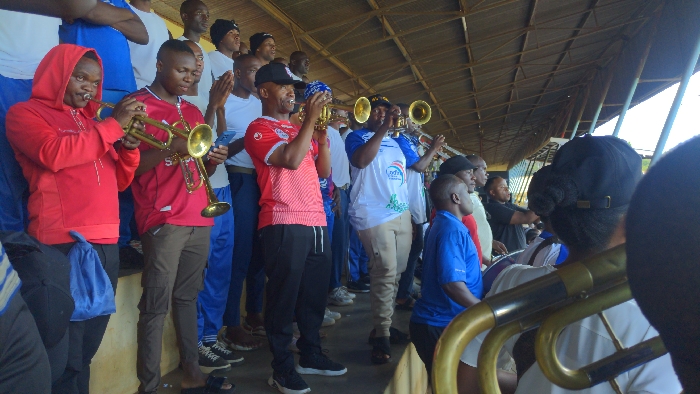 A group of people stand on bleachers, holding and playing brass instruments. Several are playing trumpets, while others have trombones. The group appears to be diverse, wearing an assortment of clothes. Many wear jerseys with team logos, while others wear casual attire. A few are wearing hats or beanies. They all seem focused on their music.