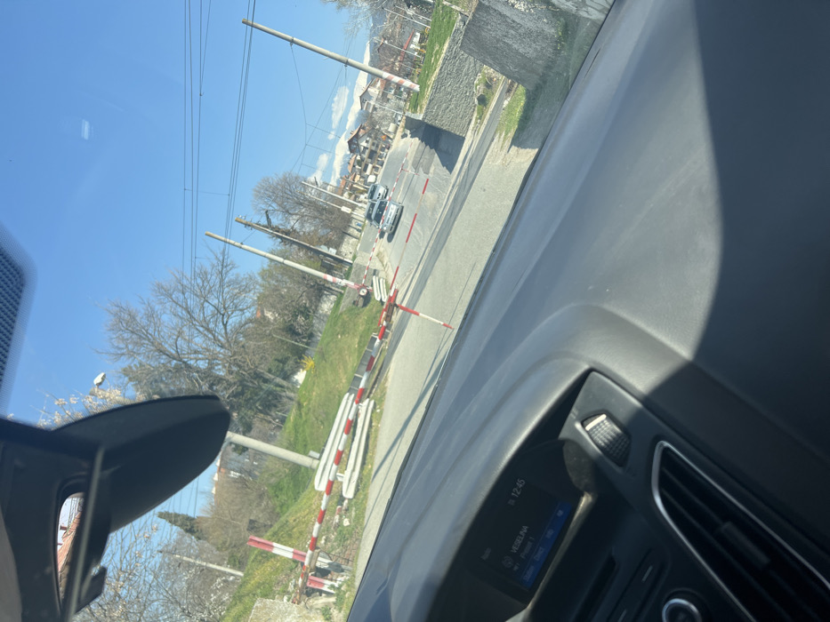- "The image provides an interior view from a vehicle, looking outward through the windshield at a railway crossing in Strumyani, Bulgaria" by FM-vwntW2, licensed under CC BY 4.0