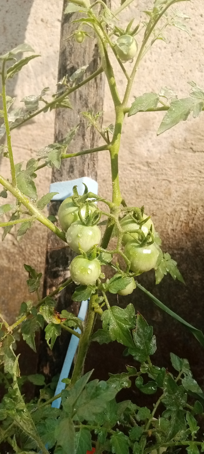 A tomato plant, supported by a wooden stake and a light blue object, shows green, unripe tomatoes clustered on its branches. Water droplets cling to the fruits and leaves. The plant's foliage is lush and green, with some leaves showing signs of insect damage. The tomatoes range in size, with the larger ones clustered in the middle of the plant. The background consists of a textured, light-colored wall, with sunlight casting shadows on the upper portion of the plant.