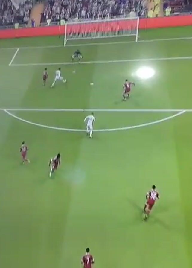 soccer game being played on a television. Players in white and maroon jerseys are moving around a green field. The players in white are closer to the goal and one player kicks the ball. The goalkeeper in the maroon jersey attempts to block the ball. In the background, a crowd is visible and advertising banners surround the field. The screen displays the words “standard chartered.” The video was captured with an Infinix HOT 40i phone.