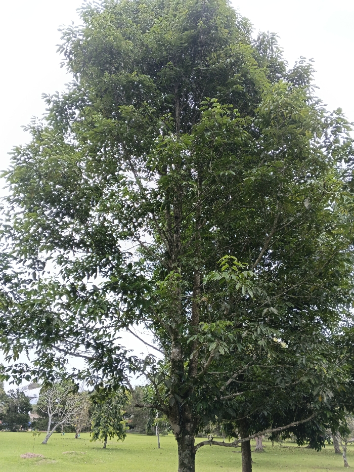 This image depicts an outdoor scene in Trairão, Brazil, centered on a tall tree with a dense, green leaf canopy and a textured, dark bark trunk that dominates the central and upper portions of the frame. The immediate foreground and mid-ground consist of an expanse of light green grass. Several other trees with varying foliage densities are scattered across the grassy background, including one notably lighter-toned tree to the left. The sky is uniformly overcast, appearing light gray or white. In the far left background, partially obscured by distant foliage, indistinct structures with light-colored walls and dark roofs are discernible. No human figures, animals, or specific actions are observed within the frame.