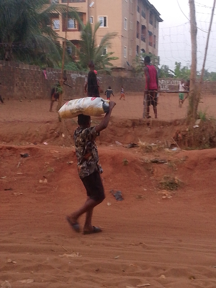 A man carries a large sack on his head as he walks on a dirt road. Several children are playing in the background, some near a makeshift soccer net. A multi-story building and lush trees are visible behind the children. The scene appears to be in a developing country, with the road showing signs of wear and the surrounding environment looking unkempt. The color tone is warm, with the red dirt road dominating the foreground.