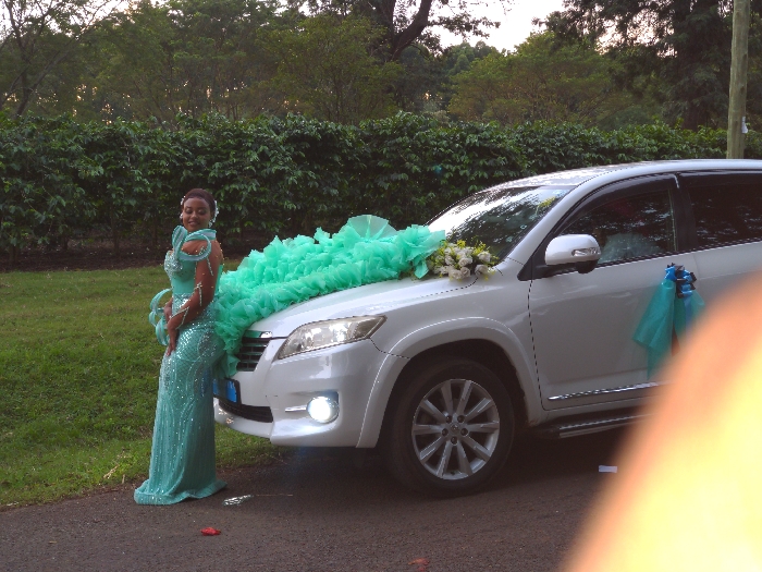 A young woman, wearing a long, teal sequined dress, stands in front of a white Toyota Rav4. The dress is adorned with a large, ruffled, teal fabric train draped over the hood of the car. The vehicle is decorated with white flowers and blue and teal ribbons tied to the door handles. The scene takes place outdoors, in a grassy area adjacent to a coffee plantation, in New Hope, Tanzania, located at -3.275 latitude and 37.317 longitude. The woman looks toward the left side of the frame while standing next to the driver's side front tire. There is a red flower on the ground in front of the woman's right foot.