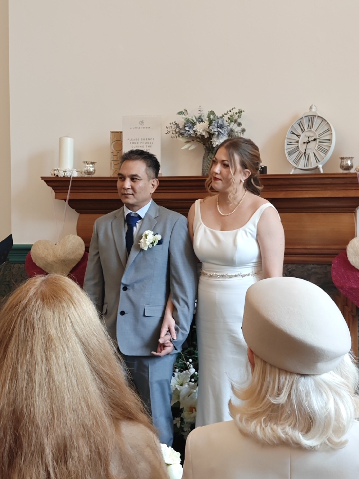 A wedding scene shows a groom in a grey suit with a blue tie and boutonniere, holding hands with a bride in a white dress, pearl necklace, and bejeweled belt. They stand before a fireplace mantel decorated with a candle, clock, flowers, a sign requesting phones to be silenced, and decorative hearts. Two guests with blonde hair, one in a beige hat, are in the foreground, facing the couple.