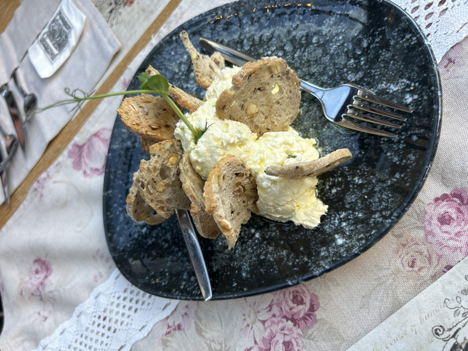 A culinary presentation, viewed from above, displays a meal arranged on a dark, irregular-shaped ceramic or stone-like plate. The plate contains several scoops of a light yellow to off-white creamy spread, garnished with finely chopped green herbs. Numerous thin, toasted slices of multigrain bread, exhibiting visible seeds and grains, are positioned around and partially inserted into the spread. A single green pea shoot or similar delicate sprout acts as a central garnish. A silver-colored metal fork is partially visible in the lower right corner of the plate, and a knife handle is visible on the left edge. The plate rests on a light-colored tablecloth featuring a faded floral pattern of pink roses and green foliage. A white, crocheted lace element is visible on the left side of the tablecloth. In the background, a wooden table surface is visible, along with additional cutlery placed on a plain napkin and a small decorative card or menu holder. The scene is consistent with an indoor dining establishment. The image contains no explicit visual identifiers linking the location to Ruse, Bulgaria.