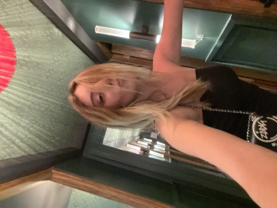 The image displays a female individual situated indoors in Mexico City, Mexico. She has blonde hair, with strands partially obscuring her face, particularly her right eye and forehead. Her left eye is visible, directed toward the camera. She is wearing a black strapless garment. A black shoulder bag with a silver chain strap is visible, featuring a white logo that reads "ZIKA." Her right arm is extended, holding the device used to capture the image. The background consists of dark teal-green walls and a light green ceiling patterned with faint lines and shadows. A large, circular, red-toned light fixture is suspended from the ceiling in the upper central portion of the frame. Two vertical, rectangular frosted wall sconces, emitting a soft white light, are affixed to the right wall. On the left, a reflective surface, possibly a mirror or glass, shows reflections of multiple elongated, vertical light sources. Dark wood or dark-colored trim frames architectural elements on the left and right sides of the scene. The overall environment appears to be an interior space with curated lighting and decor.