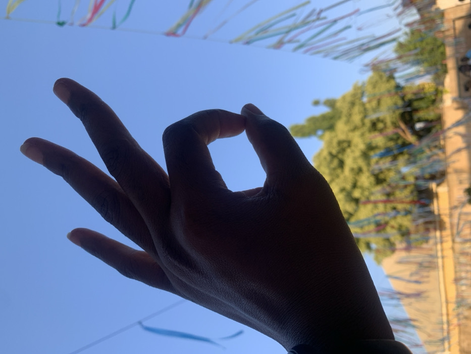 - "A human hand, silhouetted against a clear, bright blue sky, occupies the foreground, forming an "OK" gesture with the thumb and index finger creating a circle, and the middle, ring, and pinky fingers extended upwards" by FM-rhFJW2, licensed under CC BY 4.0