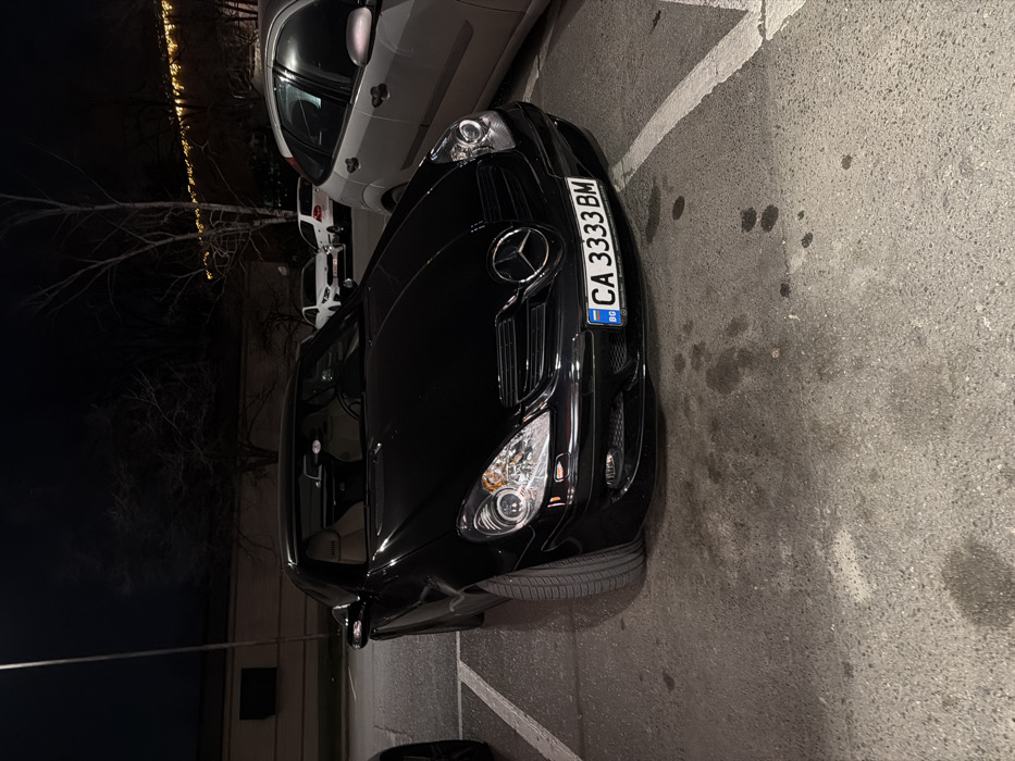 The image depicts a nighttime scene in a parking lot located in Sofia, Bulgaria. The central subject is a black Mercedes-Benz SLK-Class (R171 generation) convertible, parked in an asphalt lot marked with white lines. The vehicle displays a Bulgarian license plate, "CA 3333 BM," with "CA" designating Sofia registration. Its headlights are illuminated. Visible through the windshield are tan-colored interior seats. To the immediate right, a silver/grey Ford Focus hatchback is partially visible. On the far left, a portion of a dark-colored vehicle is present. In the background, two additional white hatchbacks are parked. The environment includes a tall streetlight pole on the left, leafless trees, and dark building structures. One distant building shows decorative yellow string lights. The asphalt pavement has various dark stains. No individuals are present or engaged in any discernible activity.