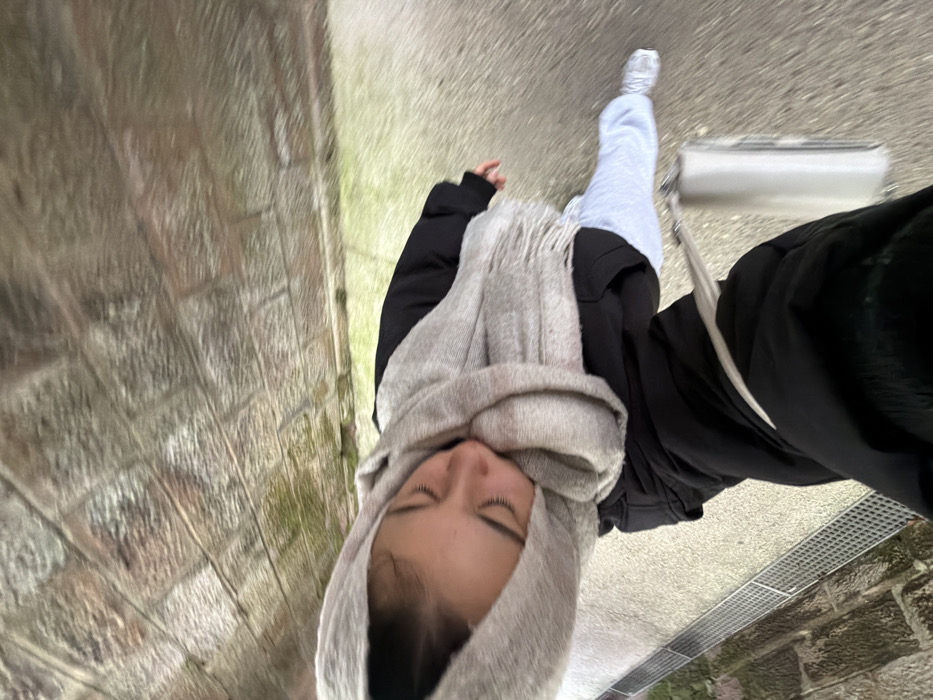 The image captures a first-person, slightly downward-angled perspective of a female subject walking outdoors in Obermodern-Zutzendorf, France. The subject's head and upper torso are visible, with her eyes closed or looking downwards, wearing a light grey scarf wrapped around her head and neck, over a black jacket. Below the jacket, light blue sweatpants and white sneakers are visible. A white rectangular bag with a white strap hangs near her lower right side. To the left, a metal drainage grate runs parallel to the walking surface. The ground consists of a light-colored paved path with patches of green growth. Above the subject, a curved, vaulted ceiling or wall constructed from irregular, reddish-brown and grey stones is visible. The scene suggests casual movement in an outdoor, possibly underpass or archway, setting.