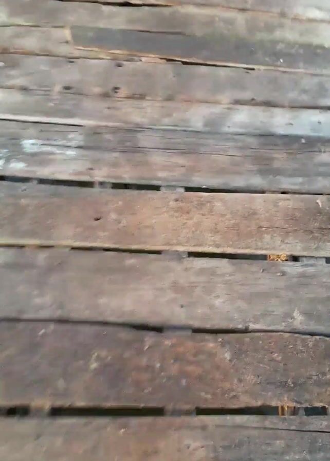A person walks on an old, wooden pier over a body of water. The pier consists of uneven wooden planks, some of which are broken or missing. The water reflects the surrounding vegetation, giving it a green hue. On the opposite bank, some structures and a vehicle are visible. The perspective is from the point of view of the person walking, capturing their sandal-clad foot as they move forward.