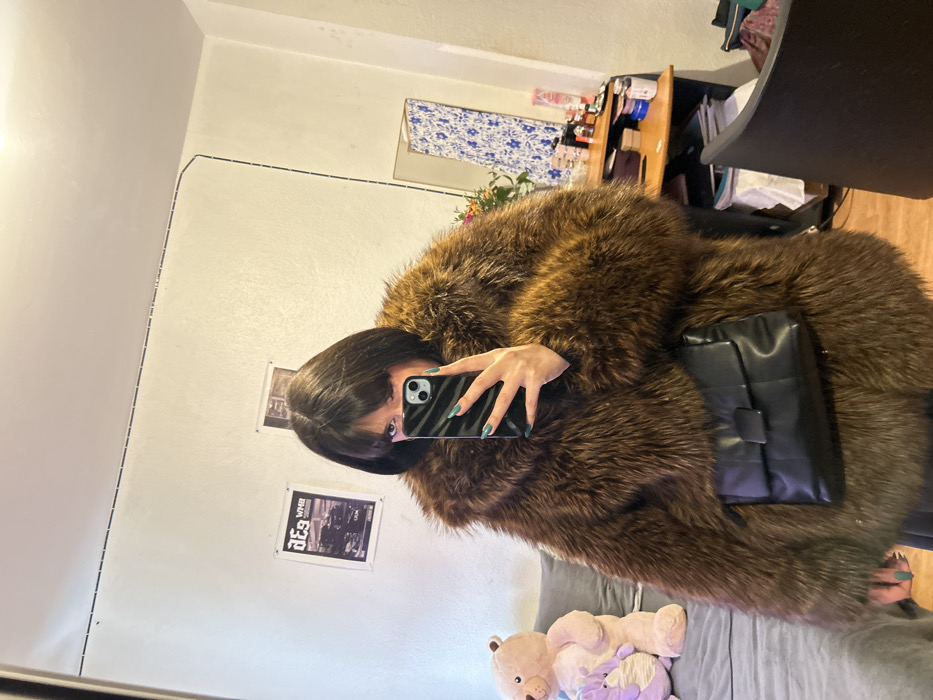 A person is depicted taking a mirror selfie indoors, in what is identified as a room within the city of Strasbourg, France. The individual, primarily obscured by the phone, has dark, shoulder-length hair with bangs and is wearing a voluminous, shaggy brown faux-fur coat. A black quilted shoulder bag with a front flap closure is worn across the body. The person holds a smartphone with a black and white zebra-striped case in their right hand, positioned to capture the reflection. Their visible fingernails are painted a teal or green color. The background, seen in reflection, indicates a domestic setting. To the left, a bed or couch with a grey cover hosts a large, light brown teddy bear and a smaller purple stuffed animal. Above this, on a light-colored wall, two posters are affixed, one clearly displaying "DES WHI" text and a dark-colored vehicle. To the right, a wooden desk or dresser is cluttered with various objects, including bottles, containers, and a small floral arrangement. A smaller mirror with a blue and white patterned frame stands on this surface. A dark cable runs along the wall and ceiling. A dark chair or stool is partially visible in the lower right foreground of the reflection.