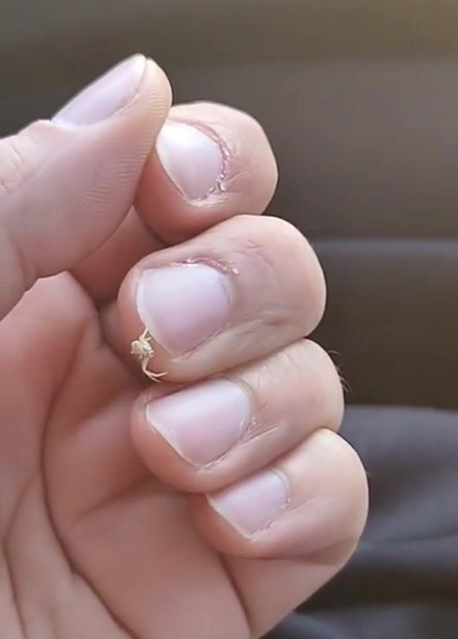 A close-up video shows a person holding their hand up, and a tiny, pale spider is crawling on their fingers
