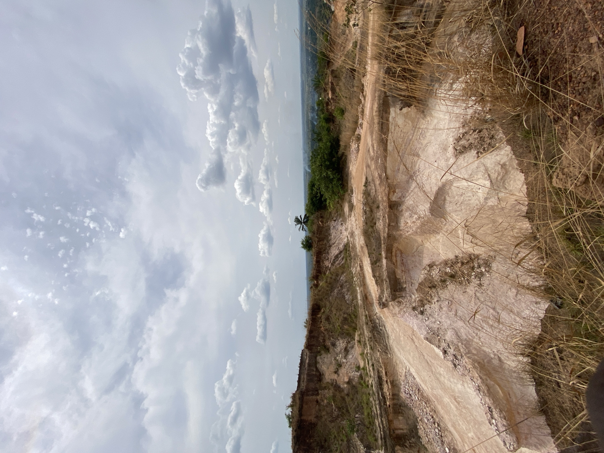 The image depicts an excavated or heavily eroded landscape in Achara, Nigeria, under a partly cloudy sky