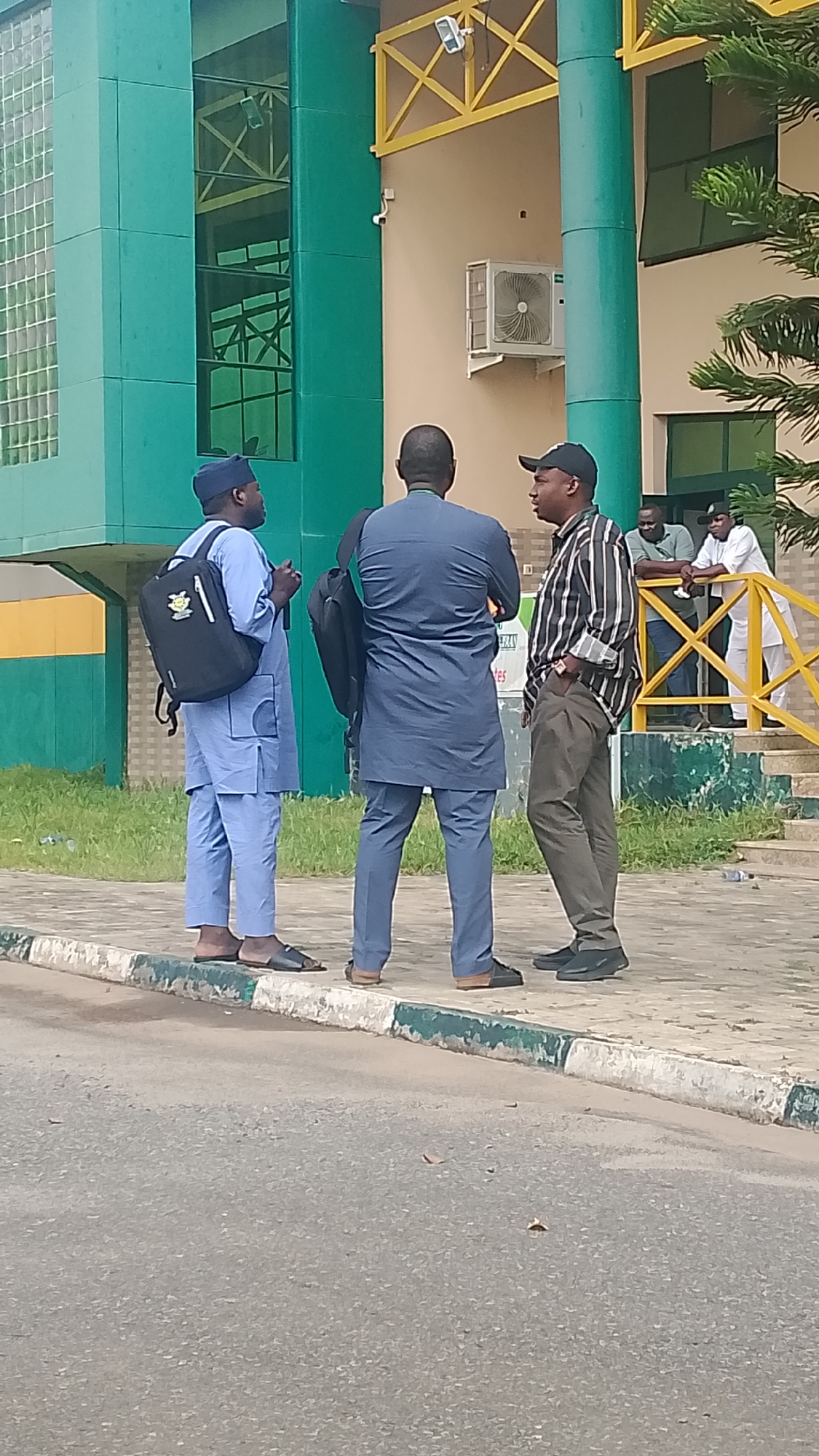 four men standing on a sidewalk adjacent to a paved road in what appears to be the Immigration Quarters in Nigeria, judging by the architectural style. Three of the men are engaged in a conversation. One is wearing a light blue traditional attire with a matching cap and a black backpack, another is wearing a dark blue suit and a black backpack, and the third is wearing a striped shirt, khaki pants, and a black baseball cap. A fourth and fifth man is seen in the background, leaning against a railing leading to a building. The building has a green and beige exterior. An air conditioning unit is mounted on the building's wall. Vegetation is visible on the right side of the frame.