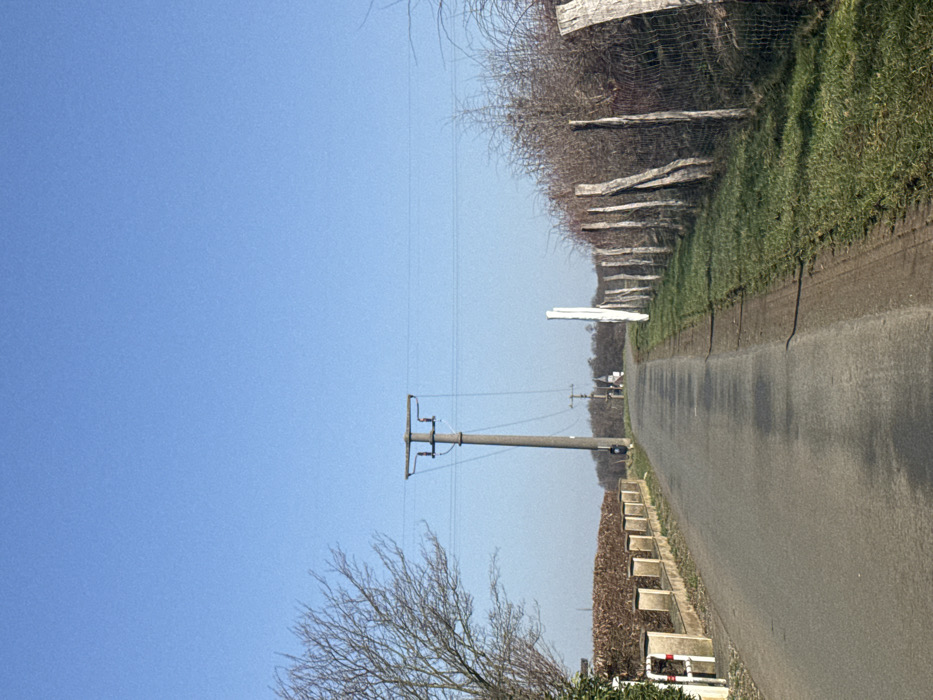 The image displays an ascending, paved road in Echzell, Germany, under a clear, light blue sky. No individuals, actions, or interactions are present. The road's surface is dark grey asphalt, showing some darker oil stains and tire tracks on the right shoulder, which is a green grass verge. To the left of the road, a low retaining wall or barrier with light-colored square posts fronts a dense, bare, reddish-brown hedge. A large, leafless deciduous tree occupies the upper left foreground. A concrete utility pole featuring a crossarm and multiple overhead power lines stands prominently on the left, with a small blue cylindrical object affixed near its base. To the right of the road, a green grass verge borders a rustic fence line comprising weathered wooden posts and wire mesh, behind which dense, thorny, and leafless vegetation grows. A single tall, slender, white vertical marker is positioned upright near the fence line in the mid-ground. In the distance along the road, a smaller utility pole is visible, followed by a white building with a dark, pointed roof or steeple, partially obscured by trees, indicating a distant structure within the landscape.
