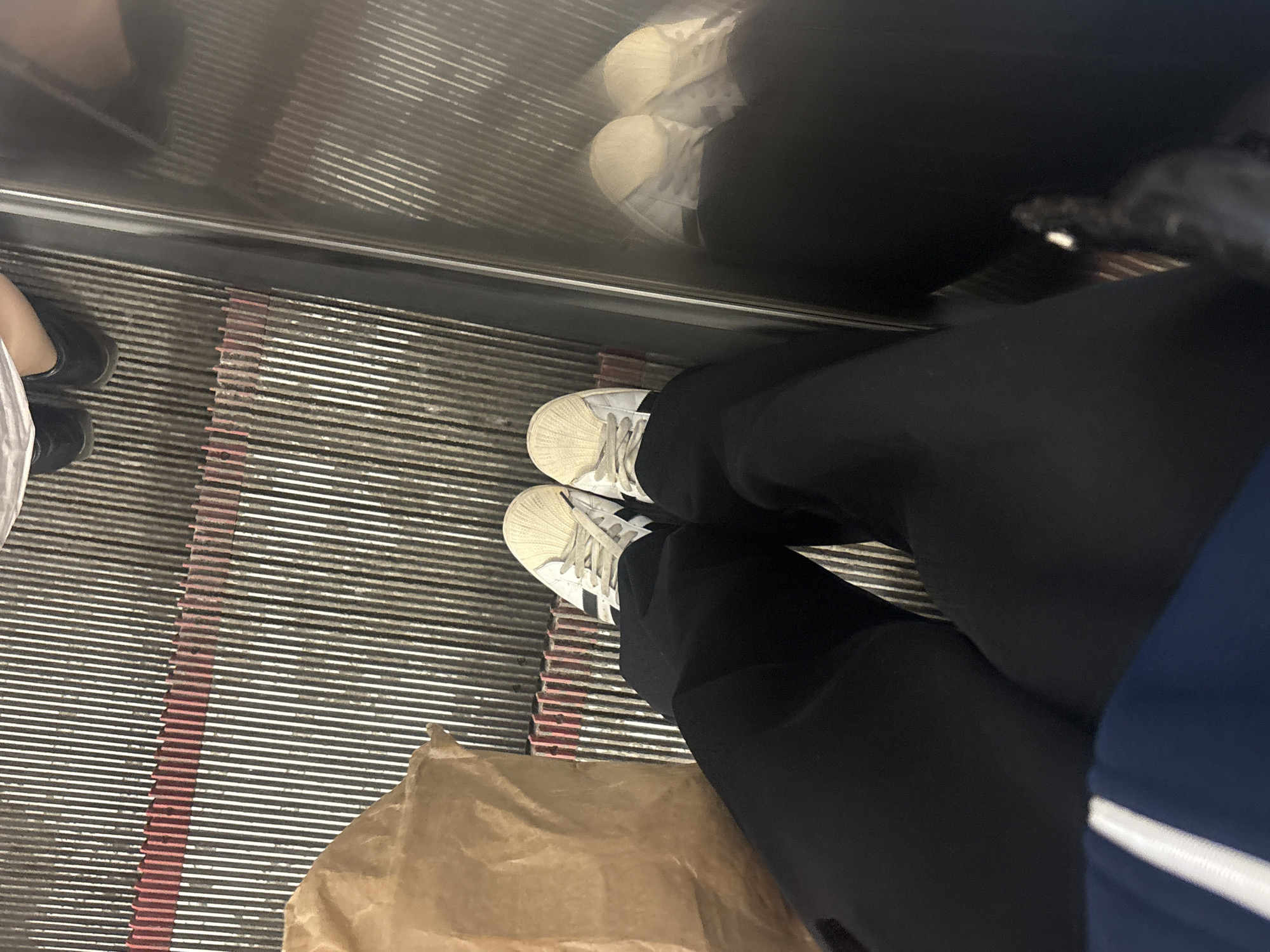 The image, taken from a top-down perspective, shows a person standing on an escalator. The person is wearing white Adidas Superstar sneakers, black pants, and a dark blue top with a white stripe on the sleeve. A brown paper bag sits at the base of the escalator steps. In the top left, two more pairs of shoes are visible, one in white Adidas Superstar sneakers and one in black shoes. The escalator has horizontal metal treads with red vertical lines denoting the separation of the steps. The lighting suggests an indoor location. There is no concrete evidence to suggest the location is Saint Petersburg, Russia.