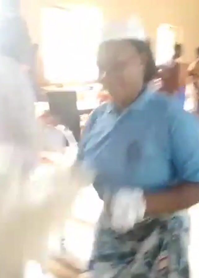 In a brightly lit interior space with light-colored walls and a window in the background, several people are present. Among them are two women in the foreground wearing blue polo shirts, floral print skirts, white gloves, and paper crowns. They are actively dancing, each holding what appears to be a white, fluffy object. Other individuals are seen around them, including a person in a white garment. The scene appears to be celebratory, possibly part of a religious event or performance. There are also blue plastic chairs and tables in the background. The image is taken with a TECNO POVA phone.