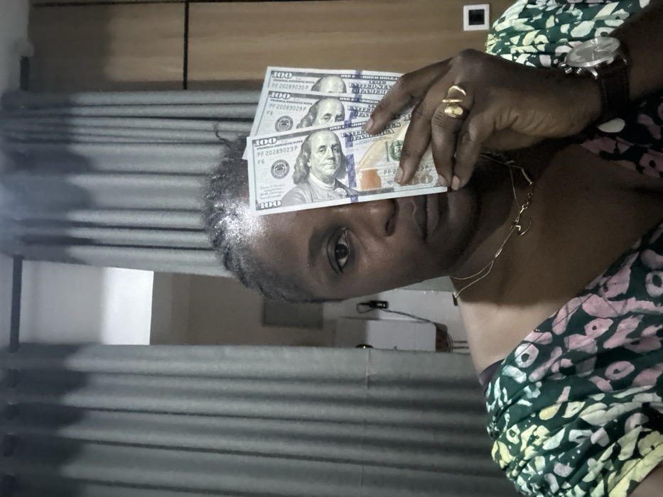 A woman holds three one hundred U.S. dollar bills over her eyes. She wears a gold ring, a watch, and a thin necklace. Her patterned blouse is primarily green with pink and yellow accents. Metal blinds are visible in the background. A small white electrical box is behind her head. A power outlet is near the ceiling.
