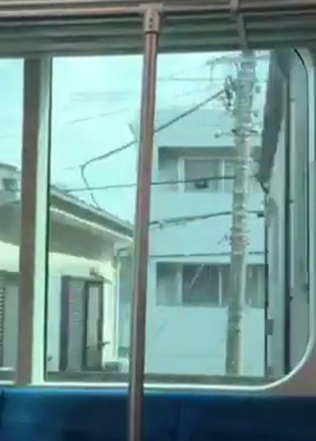 A view from inside a train, looking out the window. The train is moving, and outside the window, buildings and houses pass by in a blur. The window has a metal pole running vertically in front of it, and the seats in the train are blue. There are advertisements visible above the window. The light outside is bright, suggesting it is daytime.
