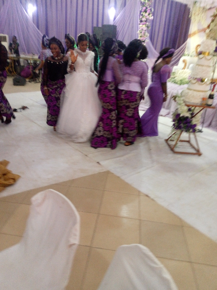 A wedding scene features a bride in a white gown, surrounded by bridesmaids in purple and purple-patterned dresses. They are near a decorated cake. The room is adorned with purple curtains and floral arrangements. The floor is tiled, and white chair covers are visible in the foreground. The lighting appears bright, possibly from overhead fixtures.