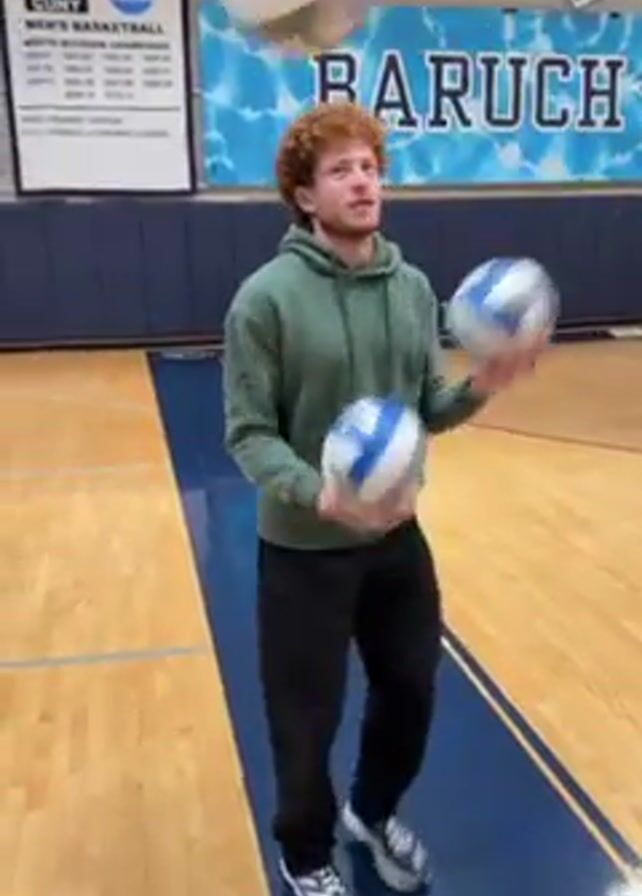 A young man with curly red hair is standing in a gymnasium. He is wearing a green hoodie, black pants, and silver and black sneakers. He is holding two volleyballs, one in each hand. He is juggling the volleyballs, tossing them up in the air, catching one in each hand and then tossing them up again. Behind him is a sign that says "BARUCH" and has a wolf logo. There is also a sign listing NCAA basketball championships. The gymnasium floor is shiny wood with blue lines. There are bleachers in the background.