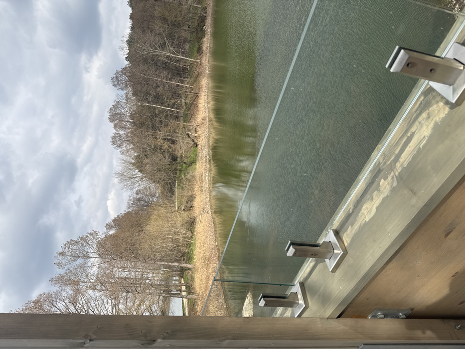 The scene is a landscape photograph taken in Nikolovo, Bulgaria, under an overcast sky. In the foreground, a light-colored wooden railing structure is visible, featuring a horizontal wooden beam with a transparent glass panel mounted atop it. The glass panel is secured by four visible polished stainless steel spigots affixed to the wooden beam; the beam shows areas of lighter discoloration or wear. Beyond this railing, a body of green-tinged water, likely a lake or pond, occupies the midground, its surface exhibiting ripples and reflections of the sky and distant vegetation. The far bank of the water is covered with dry, light-brown grass and numerous deciduous trees with bare branches, indicating late winter or early spring conditions. A narrow, unpaved path is discernible winding along the shoreline, partially obscured by the trees. A dense forest constitutes the distant background. The sky above is completely overcast with grey clouds. No individuals, human or animal, are present within the frame.
